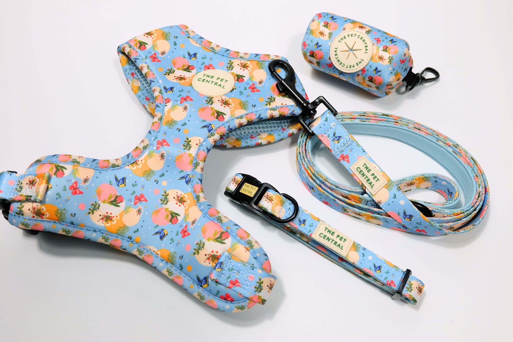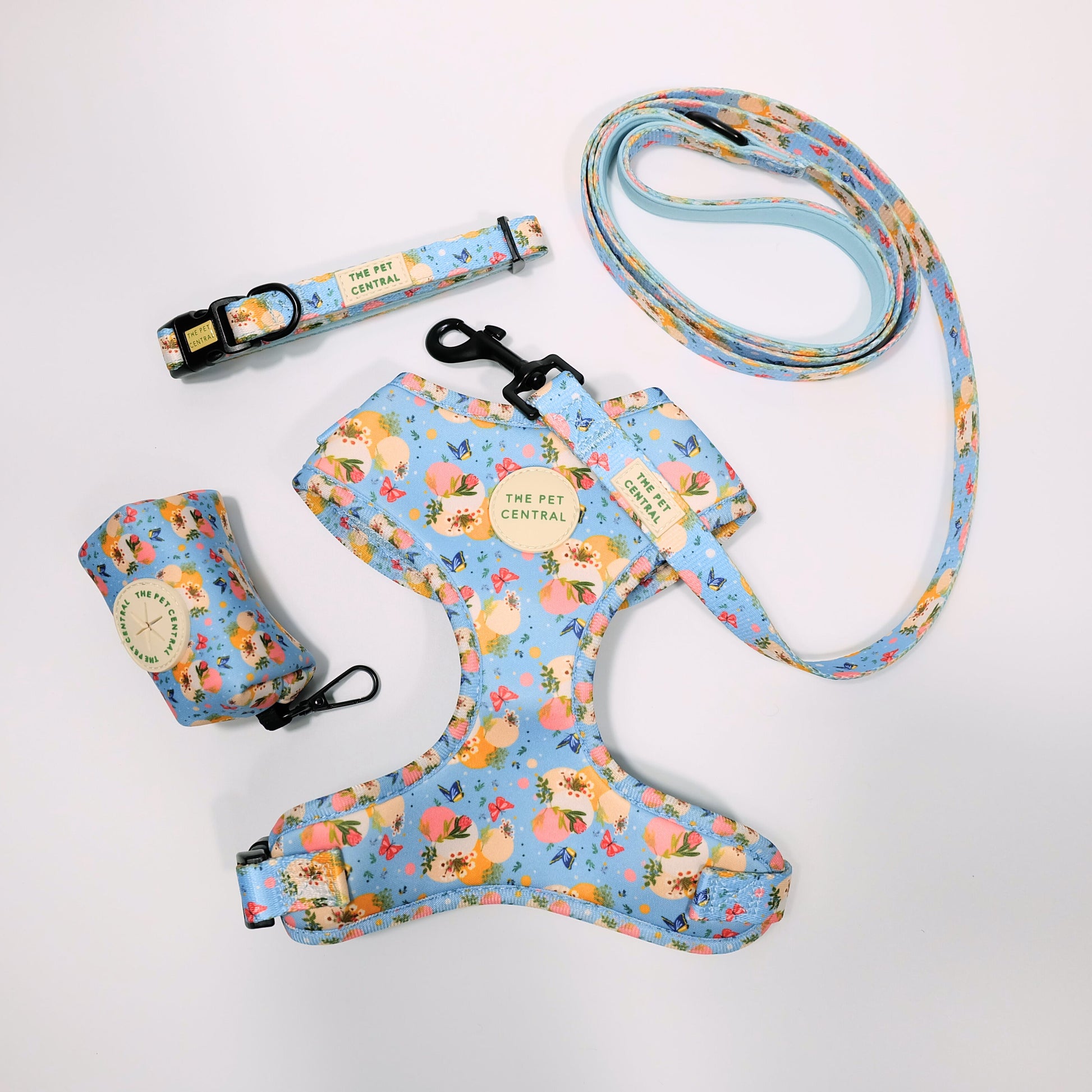 Make your pet stand out with our Butterfly Fields walkwear set! This beautiful print, featuring delicate butterflies and vibrant flowers on a soothing background, adds elegance and charm to your pet’s outdoor adventures. The complete set includes an adjustable harness, collar, lead, and poop bag holder.