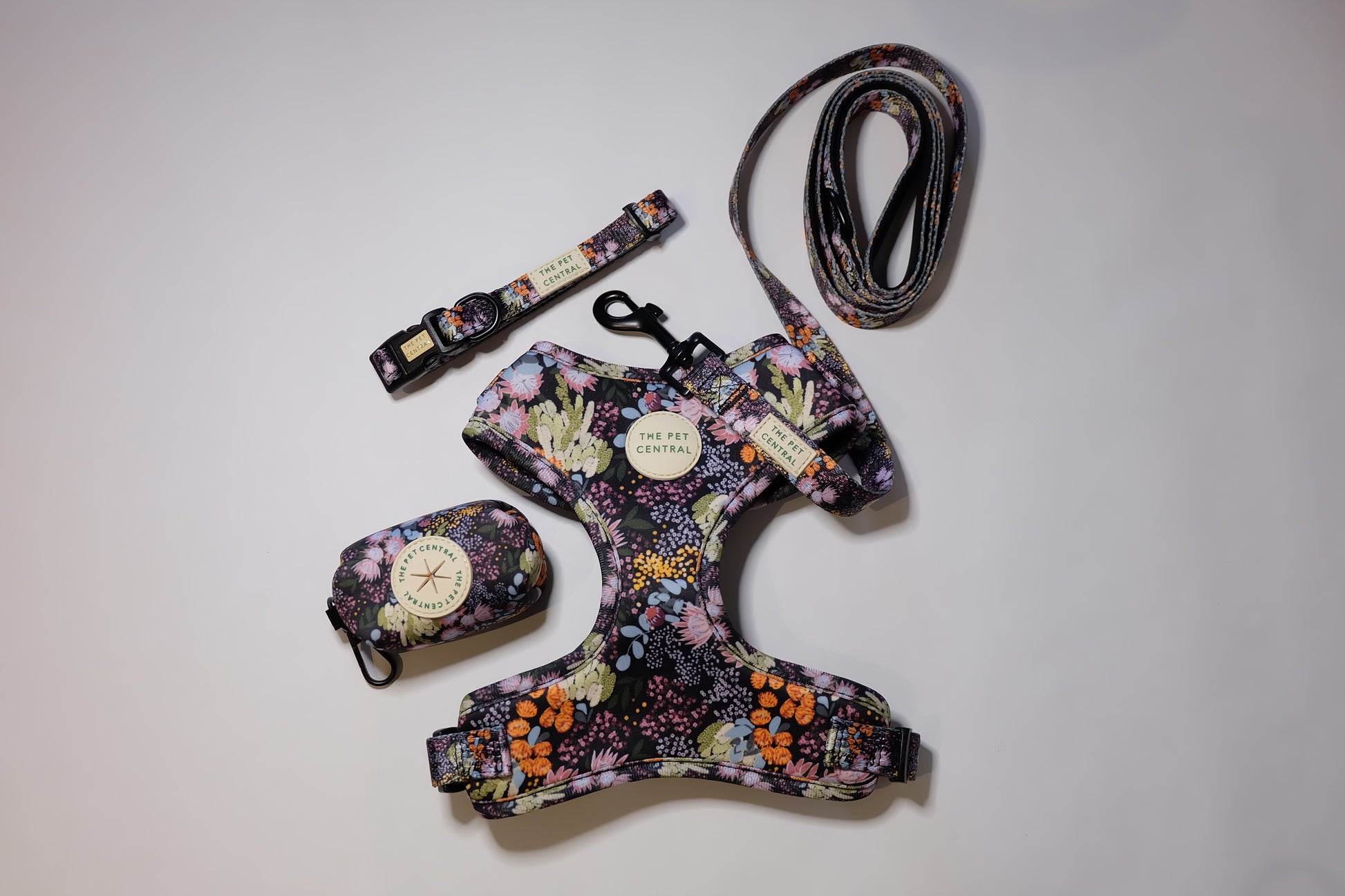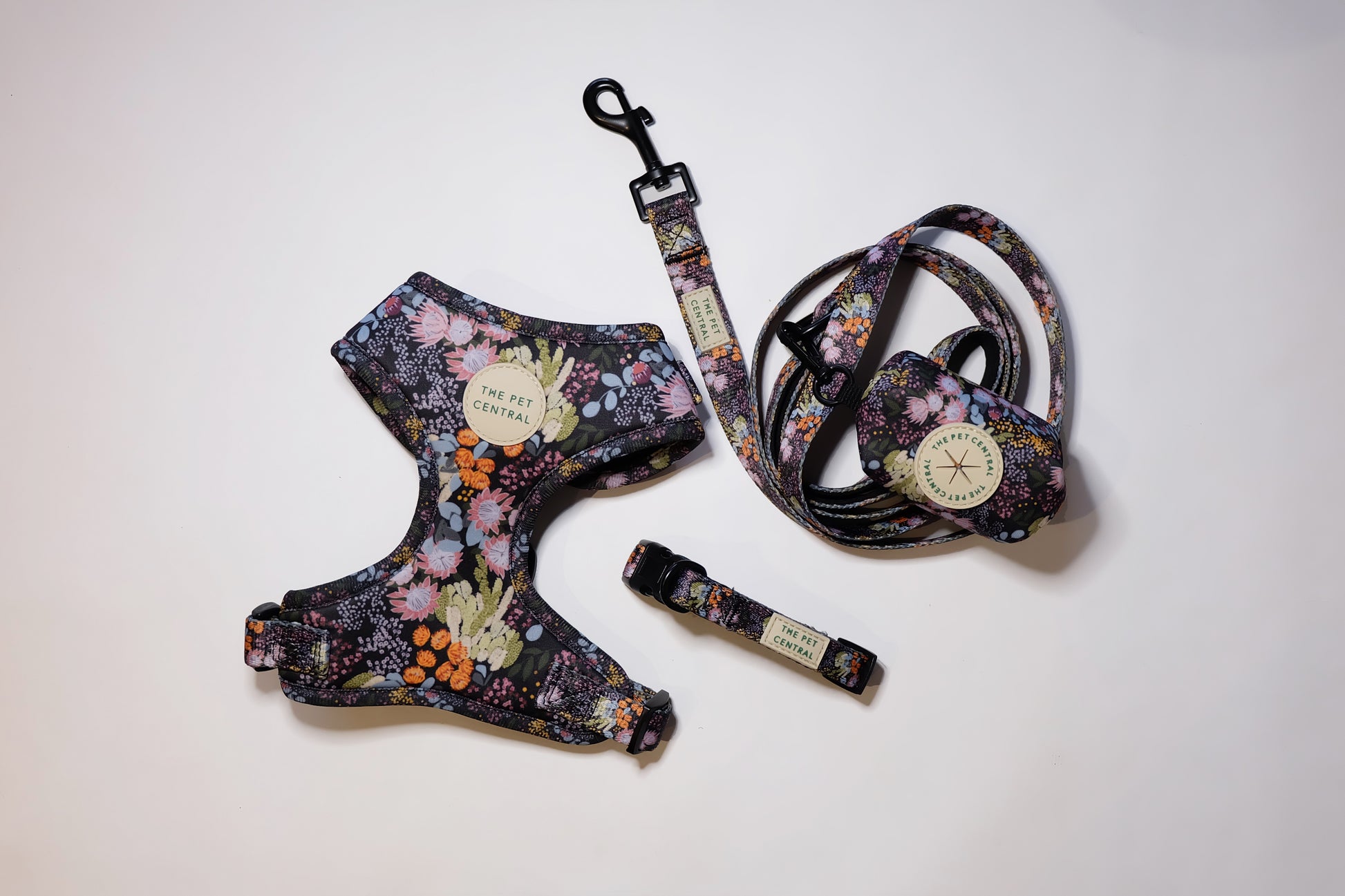 Make your pet stand out with our Native Nighttime walkwear set! This gender-neutral print, featuring native Australian flowers against a sleek black background, is perfect for adding a touch of style to your pet's outdoor adventures. The complete set includes an adjustable harness, collar, lead, and poop bag holder.