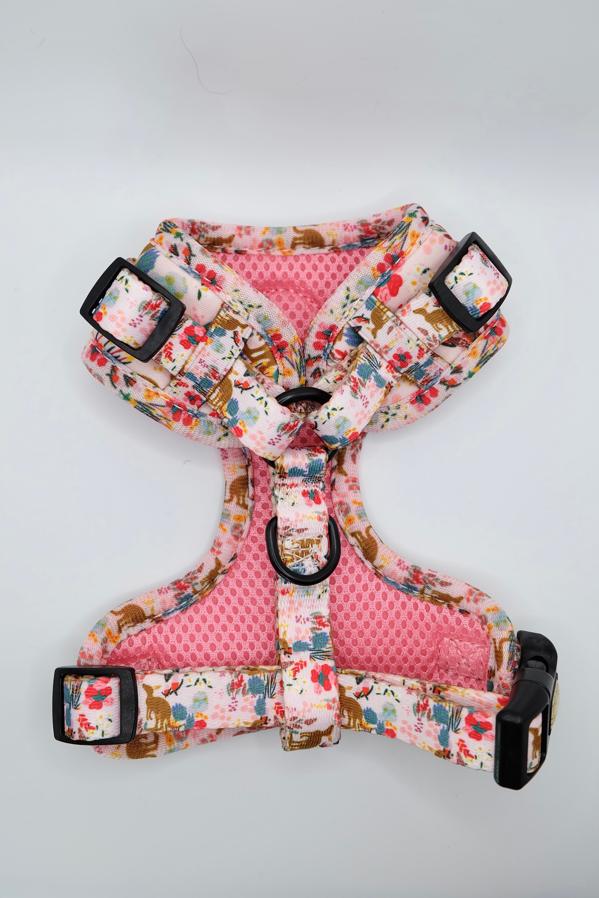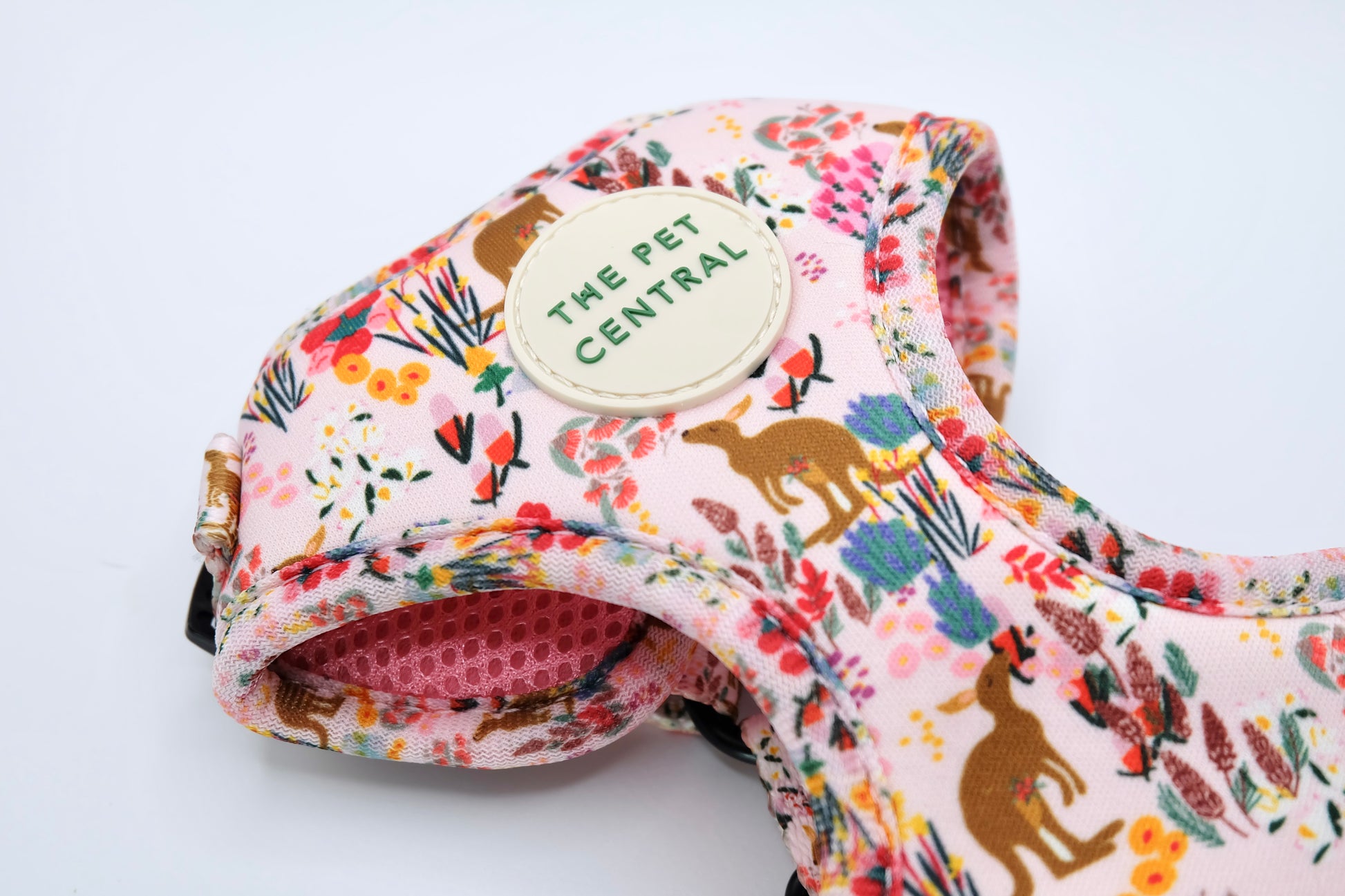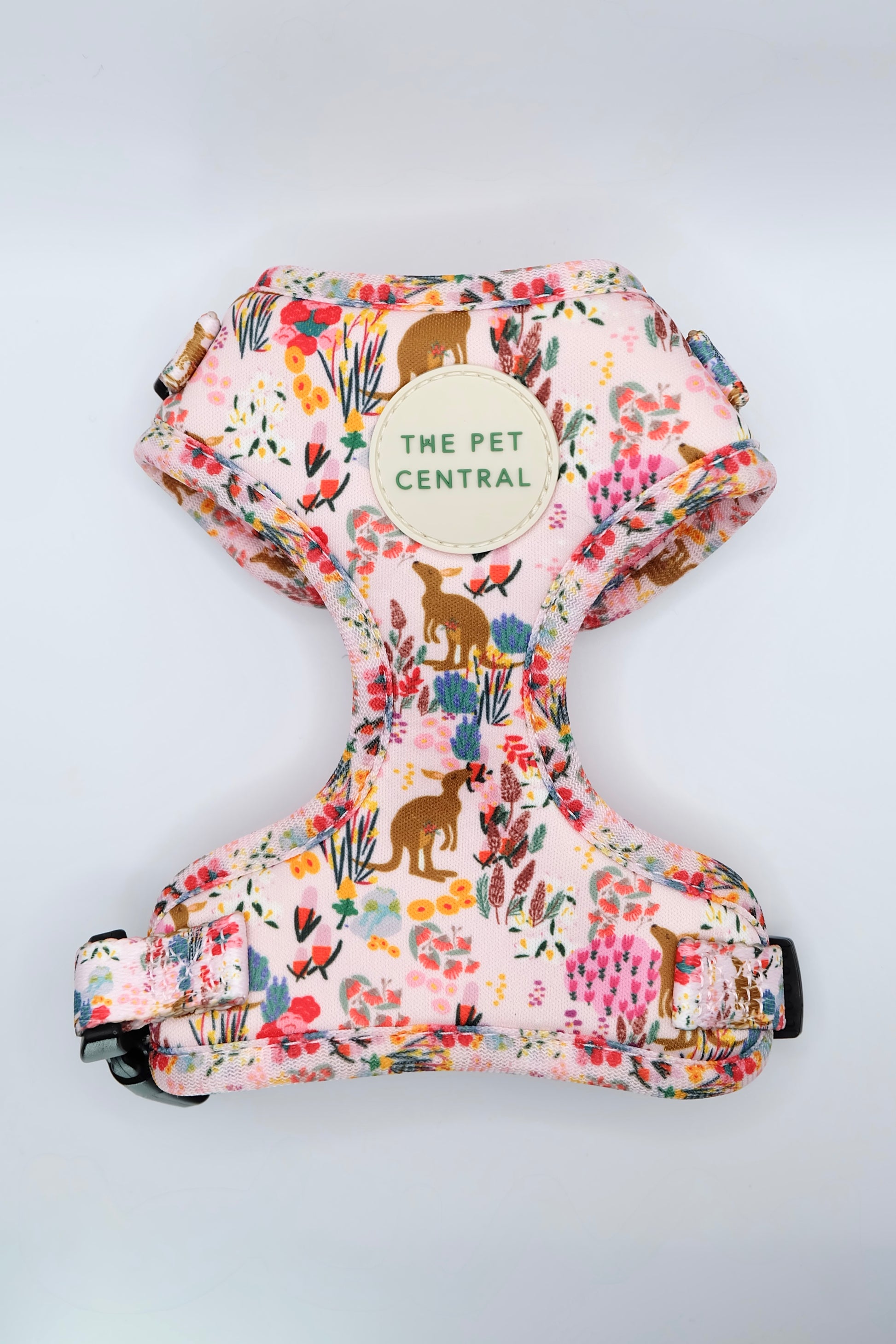 Introducing the Pink Kangaroo Dog Harness, a delightful and unique piece featuring playful kangaroos and vibrant florals on a soft pink background. This harness combines both style and comfort, ensuring your pet stands out during every walk.