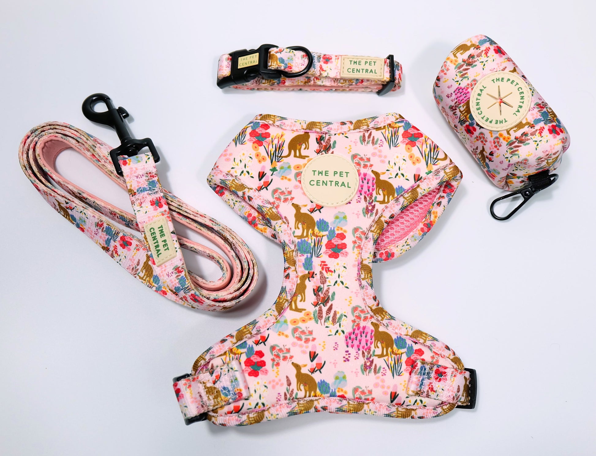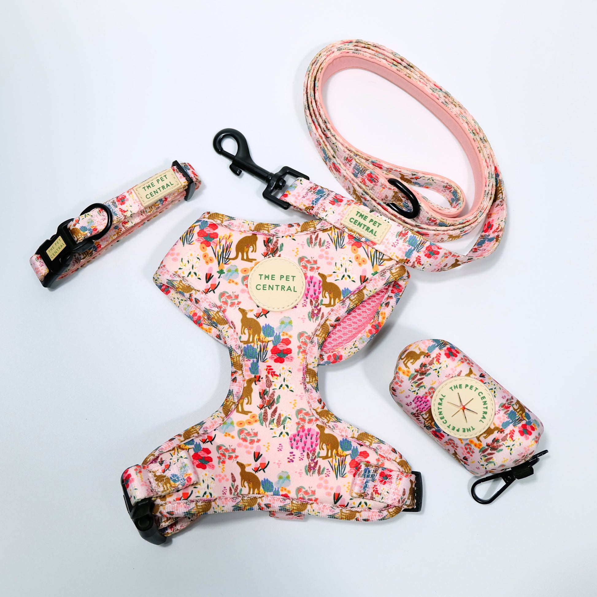 Add a playful touch to your pet’s look with our Pink Kangaroo walkwear set! This delightful print, featuring charming kangaroos and vibrant florals, is perfect for making your pet stand out on every adventure. The complete set includes an adjustable harness, collar, lead, and poop bag holder.